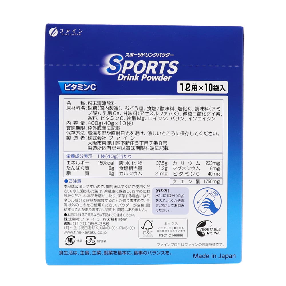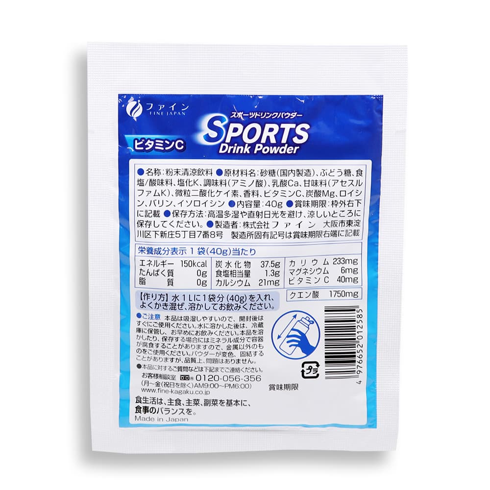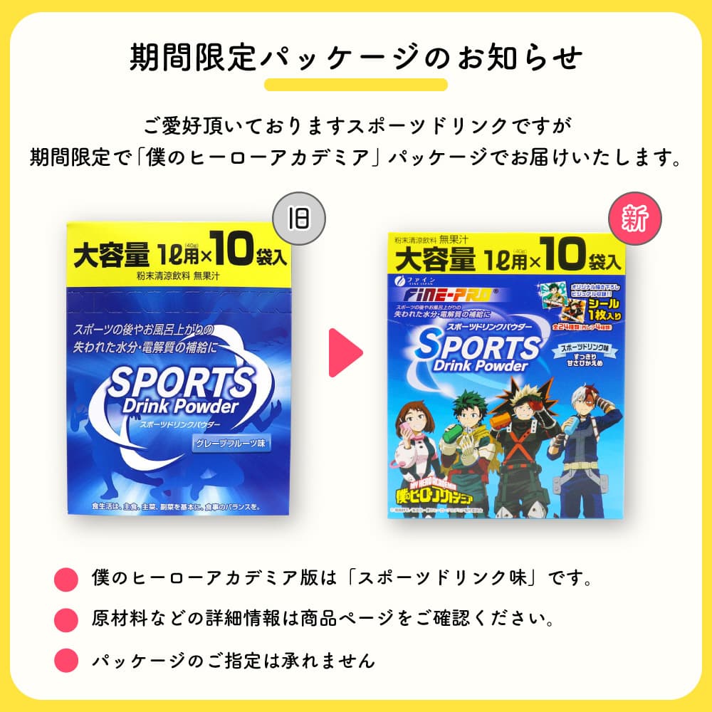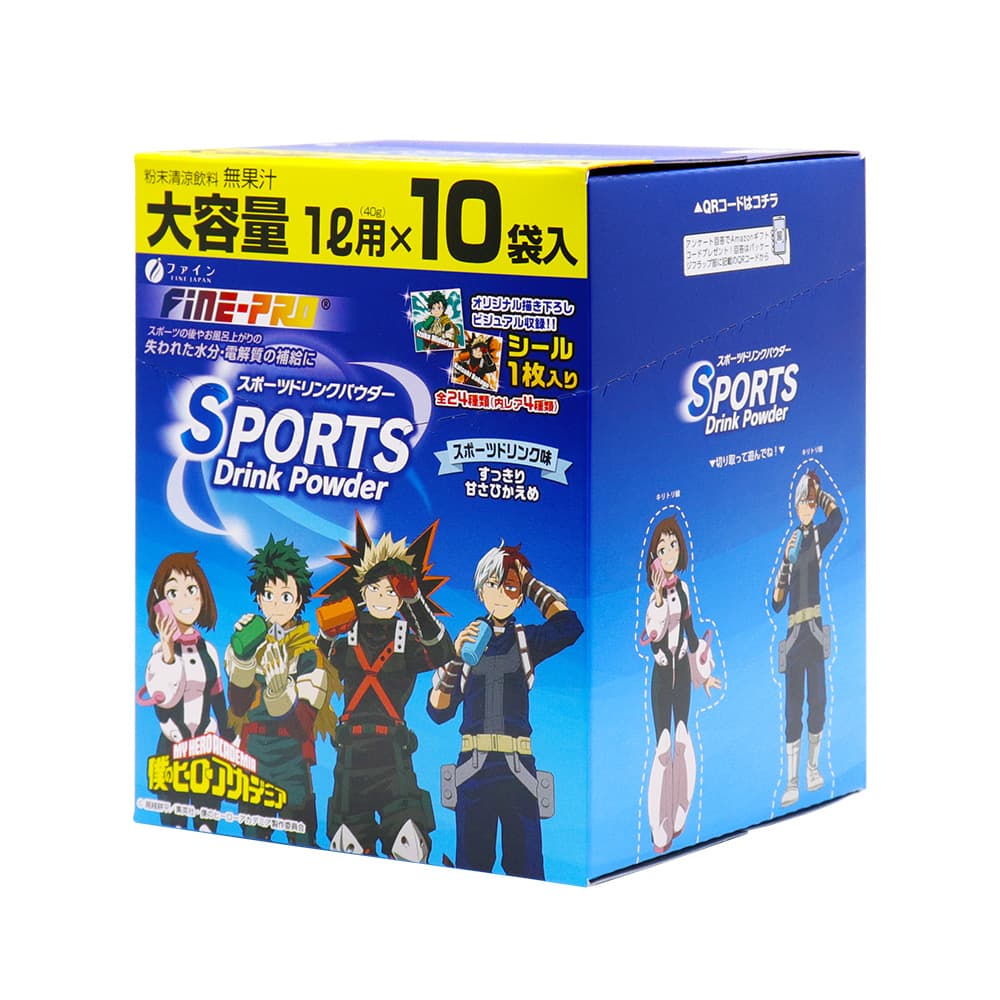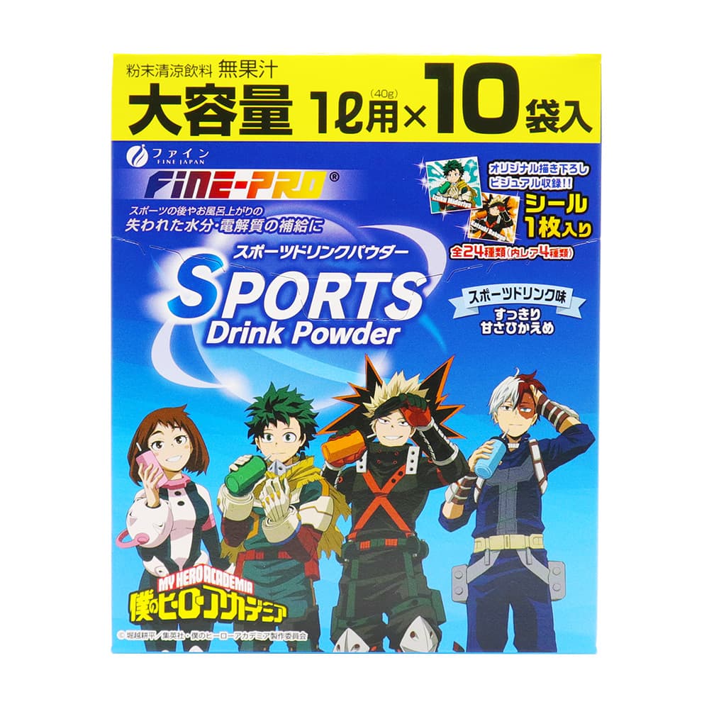 ------------------------------------------------------ 【送料無料】※沖縄・離島など一部地域を除きます ------------------------------------------------------ ファイン FINE JAPAN Fine-PRO スポーツドリンクパウダー SPORTS Drink Powder スポーツドリンク味 MY HERO ACADEMIA 僕のヒーローアカデミア オリジナル描き下ろしビジュアル収録!! シール1枚入り 全24種類(内レア4種類) すっきり 甘さひかえめ ●スポーツの後やお風呂の上がりの失われた水分・電解質の補給に ●粉末清涼飲料 無果汁 ●ビタミンC ●大容量 ●日本製(Made in Japan) ●食生活は、主食、主菜、副菜を基本に、食事のバランスを。 【名称】 粉末清涼飲料 【作り方】 水1Lに1袋分(40g)を入れ、よくかき混ぜ、溶かしてお飲みください。 【内容量】1箱あたり 400g(40g×10袋) 【保存方法】 高温多湿や直射日光を避け、涼しいところに保存してください。 【ご注意】 本品は吸湿しやすいので、開封後はすぐにご使用ください。 水に溶かした後は、冷蔵庫に保管し、お早めにお飲みください。 本品を溶かしたり、保存する場合にはミネラル成分で容器が腐食することがありますので、金属以外のものをご使用ください。 パウダーが変色、固結することがありますが、品質上、問題はありません。 【原材料名】 砂糖(国内製造)、ぶどう糖、食塩/酸味料、塩化K、調味料(アミノ酸)、乳酸Ca、甘味料(アセスルファムK)、微粒二酸化ケイ素、香料、ビタミンC、炭酸Mg、ロイシン、バリン、イソロイシン 【栄養成分表示】1袋(40g)当たり エネルギー:150kcal たんぱく質:0g 脂質:0g 炭水化物:37.5g 食塩相当量:1.3g カルシウム:21mg カリウム:233mg マグネシウム:6mg ビタミンC:40mg クエン酸:1750mg 【製造者】 株式会社ファイン 大阪市東淀川区下新庄5丁目7番8号 ●本品に対するご質問などは下記までご連絡ください。 株式会社ファイン お客様相談室 0120-056-356 (月〜金(祝日を除く)AM9:00〜PM6:00) ファインプロはファインの登録商標です。 証票 TOHO animation 堀越耕平/集英社・僕のヒーローアカデミア製作委員会