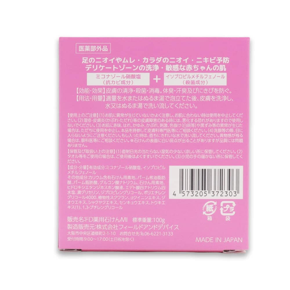 ------------------------------------------------------ 【送料無料】※沖縄・離島など一部地域を除きます ------------------------------------------------------ micowash ミコウォッシュ INTIMATE HEALTH CARE Bar SOAP 薬用せっけん 足のニオイやムレ・カラダのニオイ・ニキビ予防 デリケートゾーンの洗浄・敏感な赤ちゃんの肌 ミコナゾール硝酸塩 (抗カビ成分) + イソプロピルメチルフェノール (殺菌成分) ●無香料・無着色 ●医薬部外品 ●日本製(MADE IN JAPAN) デリケートゾーンの「ニオイ」でお悩みの方へ。 ニオイの原因の一つは、カビ(真菌)や細菌の増殖です。 ミコウォッシュは固形石鹸に抗真菌成分のミコナゾール硝酸塩を配合したデオドラントソープ。 通常の石鹸生地に高気泡タイプの石鹸生地をブレンドしました。 モコモコのやさしい泡でスッキリと汚れを洗うので、ゴシゴシこすらなくても大丈夫です。 【有効成分】 抗真菌(抗カビ)成分:ミコナゾール硝酸塩 殺菌成分:イソプロピルメチルフェノール 【効能・効果】 皮膚の清浄・殺菌・消毒。体臭・汗臭及びにきびを防ぐ。 【用法・用量】 適量を水またはぬるま湯で泡立てた後、皮膚を洗浄し、水又はぬるま湯で洗い流してください。 【販売名】 FD薬用石けんMI 【標準重量(1個あたり)】 100g 【使用上の注意】 (1)お肌に異常が生じていないかよく注意し、お肌に合わない時は使用を中止してください。 (2)湿疹・皮膚炎(かぶれ・ただれ)等の皮膚障害のある時には、悪化する恐れがありますので使用しないでください。 (3)お肌に赤味、はれ、かゆみ、かぶれ、刺激、色抜け(白斑等)や黒ずみ等の異常が生じた場合は、ただちに使用を中止し、本品を持参して皮膚科専門医等にご相談ください。 (4)洗顔等の際、目に入らないようにご注意ください。もし入った時は、直ちにきれいな水で洗い流してください。異物感が残る場合は、眼科医等にご相談ください。 ※石けんの表面に白い斑点が出ることがありますが品質には問題ありません。 【保管及び取扱い上の注意】 (1)直射日光の当たらない湿気の少ない涼しい所に保管してください。 (2)タオル等をご使用の場合は、ご使用後はよくすすいでください。 (3)小児の手の届かない所に保管してください。 【成分・分量】 有効成分:ミコナゾール硝酸塩、イソプロピルメチルフェノール その他成分:カリウム含有石けん用素地、パーム核油脂肪酸、パーム脂肪酸、グルコン酸ナトリウム、石けん用素地、ヒドロキシエタンジホスホン酸液、エデト酸四ナトリム四水塩、濃グリセリン、ジプロピレングリコール、ポリエチレングリコール4000、植物性スクワラン、ヨクイニンエキス、ジオウエキス、シャクヤクエキス、センキュウエキス、トウキエキス(1)、1,3-ブチレングリコール 【製造販売元】 株式会社フィールドアンドデバイス 大阪市中央区道修町2-1-10 お問い合わせ先:TEL06-6221-3133 受付時間9:00〜17:00(土日祝を除く) 【区分】 日本/医薬部外品