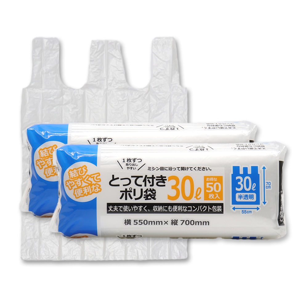 トップ > すべての商品 > コンパクト とって付き ポリ袋 30L 50枚入 ×2個(計100枚) 半透明 横55cm×縦70cm 取っ手
