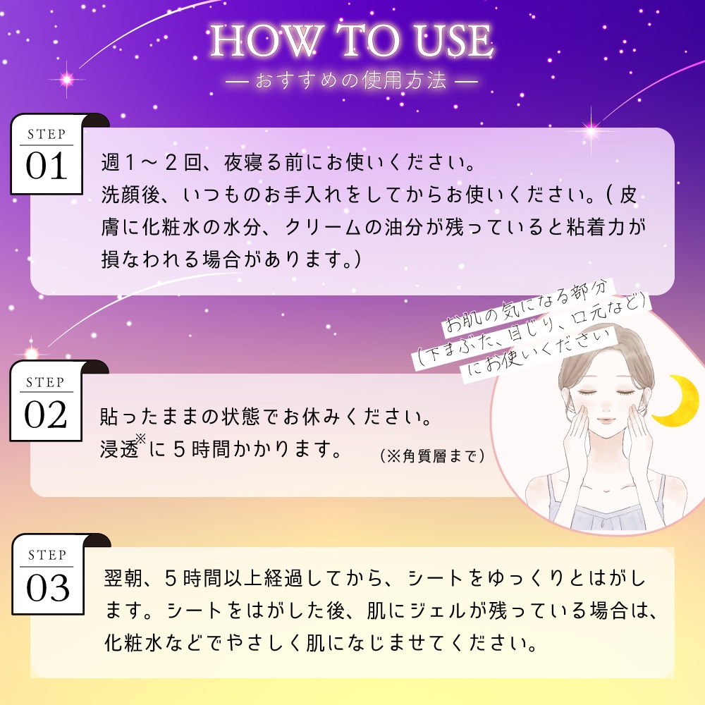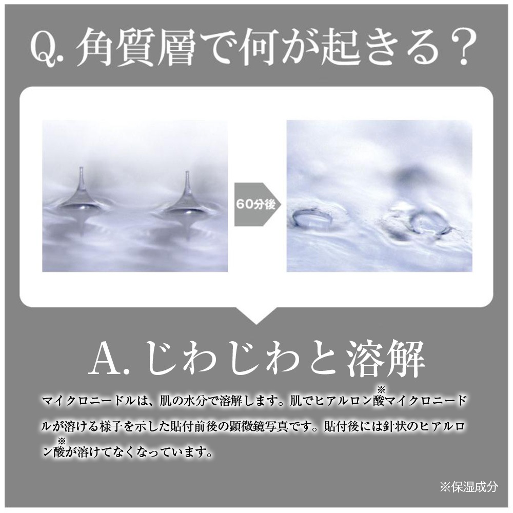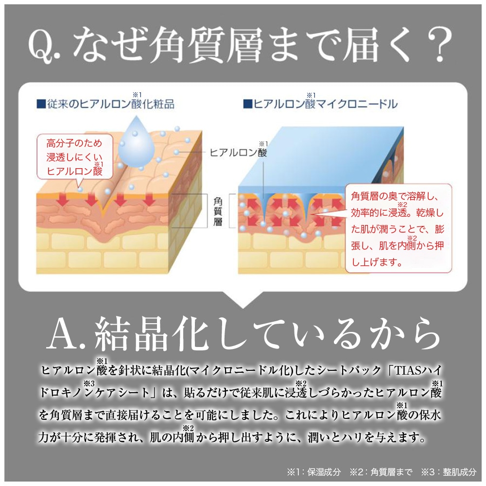 ------------------------------------------------------ ・【重要】定形外郵便について ■代引き不可・日時指定不可・同梱不可 ■ポスト投函で配達完了 ■荷物の追跡サービス・補償が一切ありません ■当店では万が一の不着や破損などに対する責任の一切を負いかねます 以上をご納得いただいた方のみご購入ください。 ------------------------------------------------------ TIAS Creation de la beaute TIAS ハイドロキノン※1 ケアシート [保湿・シート状美容液](1回分) 貼ったままお休みください 浸透※2 に5時間かかります 【販売名】 HQディープパッチ 【内容量】1個あたり 2シート(1回分) 【ご使用前の注意】 ●週1〜2回、夜寝る前にお使いください。 ●洗顔後、いつものお手入れをしてからお使いください。(皮膚に化粧水の水分、クリームの油分が残っていると粘着力が損なわれる場合があります。) ●シートの中央部分にある透明のシート部分がマイクロニードルですのではがさないでください。また、触れると溶けてしまうため、マイクロニードルには直接触れないようにしてください。 【ご使用手順】 1.化粧水やクリーム等をよくなじませてからお使いください。 2.袋からケースを取り出し、ケースの中の透明フィルムを取り出します。 3.矢印に沿って透明フィルムを前後にひねり、マイクロニードルシートを透明フィルムからはがします。 4.はがしたシートは下まぶた、目尻、または口もとなど、気になる部分にご使用ください。 チクチクする針状になった面が肌に触れる側です。下まぶたは、まつ毛につかないように、下まぶたのカーブにそってシートを軽くおきます。目尻は目尻のカーブ、口もとは鼻から口もとにそうように軽くおきます。 5.指の腹を使ってシート中央部分をギュッギュッと垂直に押し、肌を密着させます。 一度貼り付けたシートは貼り直しができません。 6.ニードル状の美容液が溶けて浸透※2 するまで、貼ったままの状態で5時間以上おいてください。 5時間以上経過してから、シートをゆっくりとはがします。シートをはがした後、肌にジェルが残っている場合は、化粧水などでやさしく肌になじませてください。 【ご使用上の注意】 ●日中や紫外線の当たる場所では使用しないでください ●使用中に紫外線を浴びると、お肌に炎症が起こることがあります。 ●美白剤や染毛剤でアレルギーを起こしたことがある方はご使用にならないでください。 ●湿気に弱いので、手が乾いた状態でご使用ください。 ●開封後はすぐにご使用ください。 ●一度お使いになったシートは必ず捨ててください。 ●お肌に異常が生じていないかよく注意して使用してください。化粧品がお肌に合わないとき即ち次のような場合には、使用を中止してください。そのまま化粧品類の使用を続けますと、症状を悪化させることがありますので、皮膚科専門医等にご相談されることをおすすめします。 (1)使用中、赤み、はれ、かゆみ、刺激、色抜け(白斑等)や黒ずみ等の異常があらわれた場合 (2)使用したお肌に、直射日光があたって上記のような異常があらわれた場合 ●傷やはれもの、しっしん等、異常のある部位にはお使いにならないでください。 ●乳幼児の手の届かない所に保管してください。 ●極端に高温又は低温の場所、直射日光のあたる場所には保管しないでください。 【全成分表示】 ヒアルロン酸Na、ハイドロキノン、ツボクサ葉/茎エキス、ハトムギ種子エキス、ジオウ根エキス、センキュウ根茎エキス、トウキ根エキス、シャクヤク根エキス、BG、ピロ亜硫酸Na ●日本製(MADE IN JAPAN) ※1 整肌成分 ※2 角質層まで 株式会社フィールドアンドデバイス 大阪市中央区道修町2-1-10 TEL.06-6221-3133