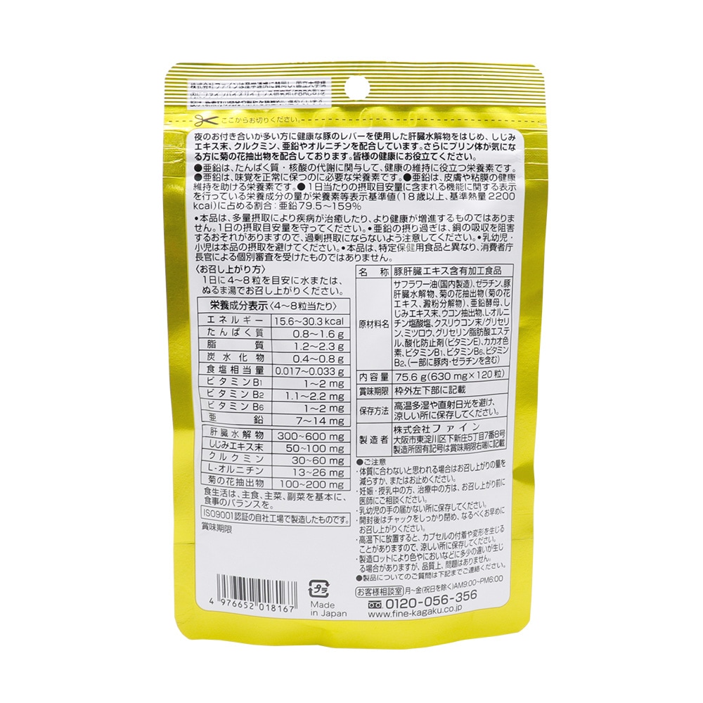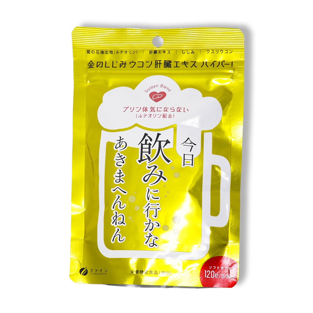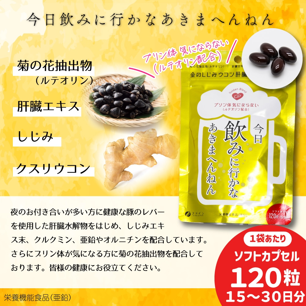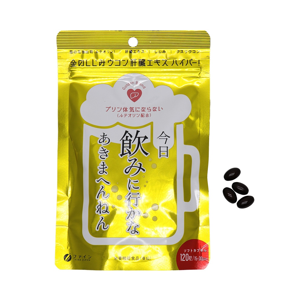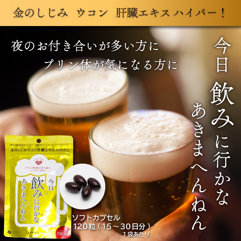 ------------------------------------------------------ 【送料無料】ネコポス(メール便)で送料無料! ■代引き不可・日時指定不可・同梱不可。 ■ポスト投函で配達完了。 ■出荷後の住所変更および住所不備による配達が発生する場合は費用が発生する場合ございます。 ------------------------------------------------------ ファイン FINE JAPAN 金のしじみ ウコン 肝臓エキス ハイパー! 120粒/15〜30日分(1袋あたり) 今日 飲みに行かなあきまへんねん プリン体 気にならない(ルテオリン配合) Golden Blend ●菊の花抽出物(ルテオリン) ●肝臓エキス ●しじみ ●クスリウコン ●栄養機能食品(亜鉛) ●ソフトカプセル ●日本製(Made in Japan) 夜のお付き合いが多い方に健康な豚のレバーを使用した肝臓水解物をはじめ、しじみエキス末、クルクミン、亜鉛やオルニチンを配合しています。 さらにプリン体が気になる方に菊の花抽出物を配合しております。 皆様の健康にお役立てください。 ●亜鉛は、たんぱく質・核酸の代謝に関与して、健康の維持に役立つ栄養素です。 ●亜鉛は、味覚を正常に保つのに必要な栄養素です。 ●亜鉛は、皮膚や粘膜の健康維持を助ける栄養素です。 ●1日当たりの摂取目安量に含まれる機能に関する表示を行っている栄養成分の量が栄養素等表示基準値(18歳以上、基準熱量2200kcal)に占める割合:亜鉛79.5〜159% 食生活は、主食、主菜、副菜を基本に、食事のバランスを。 ●本品は、多量摂取により疾病が治癒したり、より健康が増進するものではありません。1日の摂取目安量を守ってください。 ●亜鉛の摂り過ぎは、銅の吸収を阻害するおそれがありますので、過剰摂取にならないよう注意してください。 ●乳幼児・小児は本品の摂取を避けてください。 ●本品は、特定保健用食品と異なり、消費者庁長官による個別審査を受けたものではありません。 【お召し上がり方】 1日に4〜8粒を目安に水または、ぬるま湯でお召し上がりください。 【栄養成分表示(4〜8粒当たり)】 エネルギー:15.6〜30.3kcal たんぱく質:0.8〜1.6g 脂質:1.2〜2.3g 炭水化物:0.4〜0.8g 食塩相当量:0.017〜0.033g ビタミンB1:1〜2mg ビタミンB2:1.1〜2.2mg ビタミンB6:1〜2mg 亜鉛:7〜14mg 肝臓水解物:300〜600mg しじみエキス末:50〜100mg クルクミン:30〜60mg L-オルニチン:13〜26mg 菊の花抽出物:100〜200mg 【名称】 豚肝臓エキス含有加工食品 【原材料名】 サフラワー油(国内製造)、ゼラチン、豚肝臓水解物、菊の花抽出物(菊の花エキス、澱粉分解物)、亜鉛酵母、しじみエキス末、ウコン抽出物、L-オルニチン塩酸塩、クスリウコン末/グリセリン、ミツロウ、グリセリン脂肪酸エステル、酸化防止剤(ビタミンE)、カカオ色素、ビタミンB1、ビタミンB6、ビタミンB2、(一部に豚肉・ゼラチンを含む) 【内容量】1袋あたり 75.6g(630mg×120粒) 【保存方法】 高温多湿や直射日光を避け、涼しい所に保存してください。 【ご注意】 ・体質に合わないと思われる場合はお召し上がりの量を減らすか、またはお止めください。 ・妊娠・授乳中の方、治療中の方は、お召し上がり前に医師にご相談ください。 ・乳幼児の手の届かない所に保存してください。 ・開封後はチャックをしっかり閉め、なるべくお早めにお召し上がりください。 ・高温下に放置すると、カプセルの付着や変形を生じることがありますので、涼しい所に保存してください。 ・製造ロットにより色やにおいなどに多少の違いが生じる場合がありますが、品質上、問題はありません。 【製造者】 株式会社ファイン 大阪市東淀川区下新庄5丁目7番8号 ●製品についてのご質問は下記までご連絡ください。 お客様相談室 月〜金(祝日を除く)AM9:00〜PM6:00 0120-056-356 ISO9001認証の自社工場で製造したものです。 株式会社ファインは産学連携に賛同し、国立大学構内にファインバイオサイエンス研究所(FBRC)を設け、新素材の開発や解析を積極的に進めています。