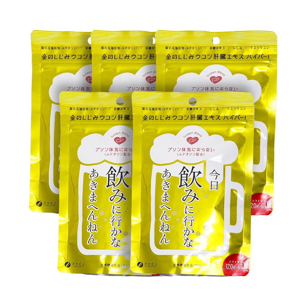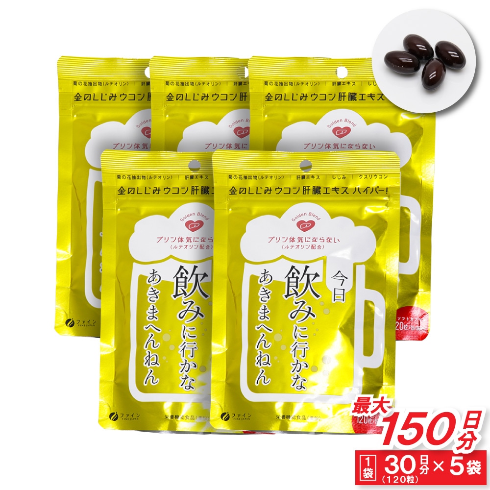 ------------------------------------------------------ 【送料無料】ネコポス(メール便)で送料無料! ■代引き不可・日時指定不可・同梱不可。 ■ポスト投函で配達完了。 ■出荷後の住所変更および住所不備による配達が発生する場合は費用が発生する場合ございます。 ------------------------------------------------------ ファイン FINE JAPAN 金のしじみ ウコン 肝臓エキス ハイパー! 120粒/15〜30日分(1袋あたり) 今日 飲みに行かなあきまへんねん プリン体 気にならない(ルテオリン配合) Golden Blend ●菊の花抽出物(ルテオリン) ●肝臓エキス ●しじみ ●クスリウコン ●栄養機能食品(亜鉛) ●ソフトカプセル ●日本製(Made in Japan) 夜のお付き合いが多い方に健康な豚のレバーを使用した肝臓水解物をはじめ、しじみエキス末、クルクミン、亜鉛やオルニチンを配合しています。 さらにプリン体が気になる方に菊の花抽出物を配合しております。 皆様の健康にお役立てください。 ●亜鉛は、たんぱく質・核酸の代謝に関与して、健康の維持に役立つ栄養素です。 ●亜鉛は、味覚を正常に保つのに必要な栄養素です。 ●亜鉛は、皮膚や粘膜の健康維持を助ける栄養素です。 ●1日当たりの摂取目安量に含まれる機能に関する表示を行っている栄養成分の量が栄養素等表示基準値(18歳以上、基準熱量2200kcal)に占める割合:亜鉛79.5〜159% 食生活は、主食、主菜、副菜を基本に、食事のバランスを。 ●本品は、多量摂取により疾病が治癒したり、より健康が増進するものではありません。1日の摂取目安量を守ってください。 ●亜鉛の摂り過ぎは、銅の吸収を阻害するおそれがありますので、過剰摂取にならないよう注意してください。 ●乳幼児・小児は本品の摂取を避けてください。 ●本品は、特定保健用食品と異なり、消費者庁長官による個別審査を受けたものではありません。 【お召し上がり方】 1日に4〜8粒を目安に水または、ぬるま湯でお召し上がりください。 【栄養成分表示(4〜8粒当たり)】 エネルギー:15.6〜30.3kcal たんぱく質:0.8〜1.6g 脂質:1.2〜2.3g 炭水化物:0.4〜0.8g 食塩相当量:0.017〜0.033g ビタミンB1:1〜2mg ビタミンB2:1.1〜2.2mg ビタミンB6:1〜2mg 亜鉛:7〜14mg 肝臓水解物:300〜600mg しじみエキス末:50〜100mg クルクミン:30〜60mg L-オルニチン:13〜26mg 菊の花抽出物:100〜200mg 【名称】 豚肝臓エキス含有加工食品 【原材料名】 サフラワー油(国内製造)、ゼラチン、豚肝臓水解物、菊の花抽出物(菊の花エキス、澱粉分解物)、亜鉛酵母、しじみエキス末、ウコン抽出物、L-オルニチン塩酸塩、クスリウコン末/グリセリン、ミツロウ、グリセリン脂肪酸エステル、酸化防止剤(ビタミンE)、カカオ色素、ビタミンB1、ビタミンB6、ビタミンB2、(一部に豚肉・ゼラチンを含む) 【内容量】1袋あたり 75.6g(630mg×120粒) 【保存方法】 高温多湿や直射日光を避け、涼しい所に保存してください。 【ご注意】 ・体質に合わないと思われる場合はお召し上がりの量を減らすか、またはお止めください。 ・妊娠・授乳中の方、治療中の方は、お召し上がり前に医師にご相談ください。 ・乳幼児の手の届かない所に保存してください。 ・開封後はチャックをしっかり閉め、なるべくお早めにお召し上がりください。 ・高温下に放置すると、カプセルの付着や変形を生じることがありますので、涼しい所に保存してください。 ・製造ロットにより色やにおいなどに多少の違いが生じる場合がありますが、品質上、問題はありません。 【製造者】 株式会社ファイン 大阪市東淀川区下新庄5丁目7番8号 ●製品についてのご質問は下記までご連絡ください。 お客様相談室 月〜金(祝日を除く)AM9:00〜PM6:00 0120-056-356 ISO9001認証の自社工場で製造したものです。 株式会社ファインは産学連携に賛同し、国立大学構内にファインバイオサイエンス研究所(FBRC)を設け、新素材の開発や解析を積極的に進めています。