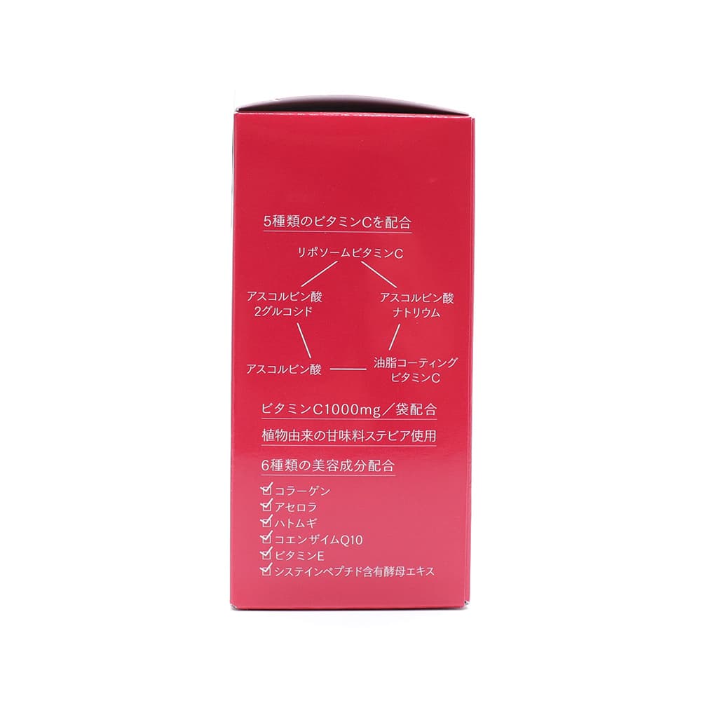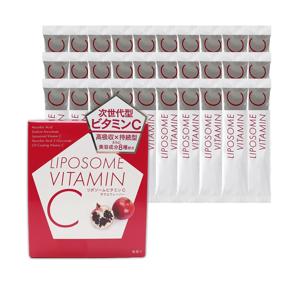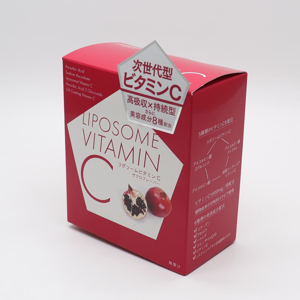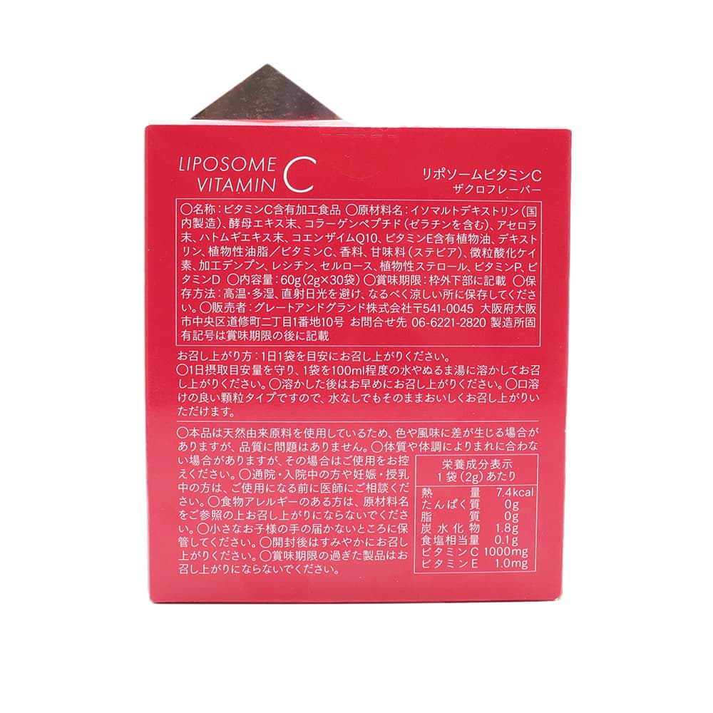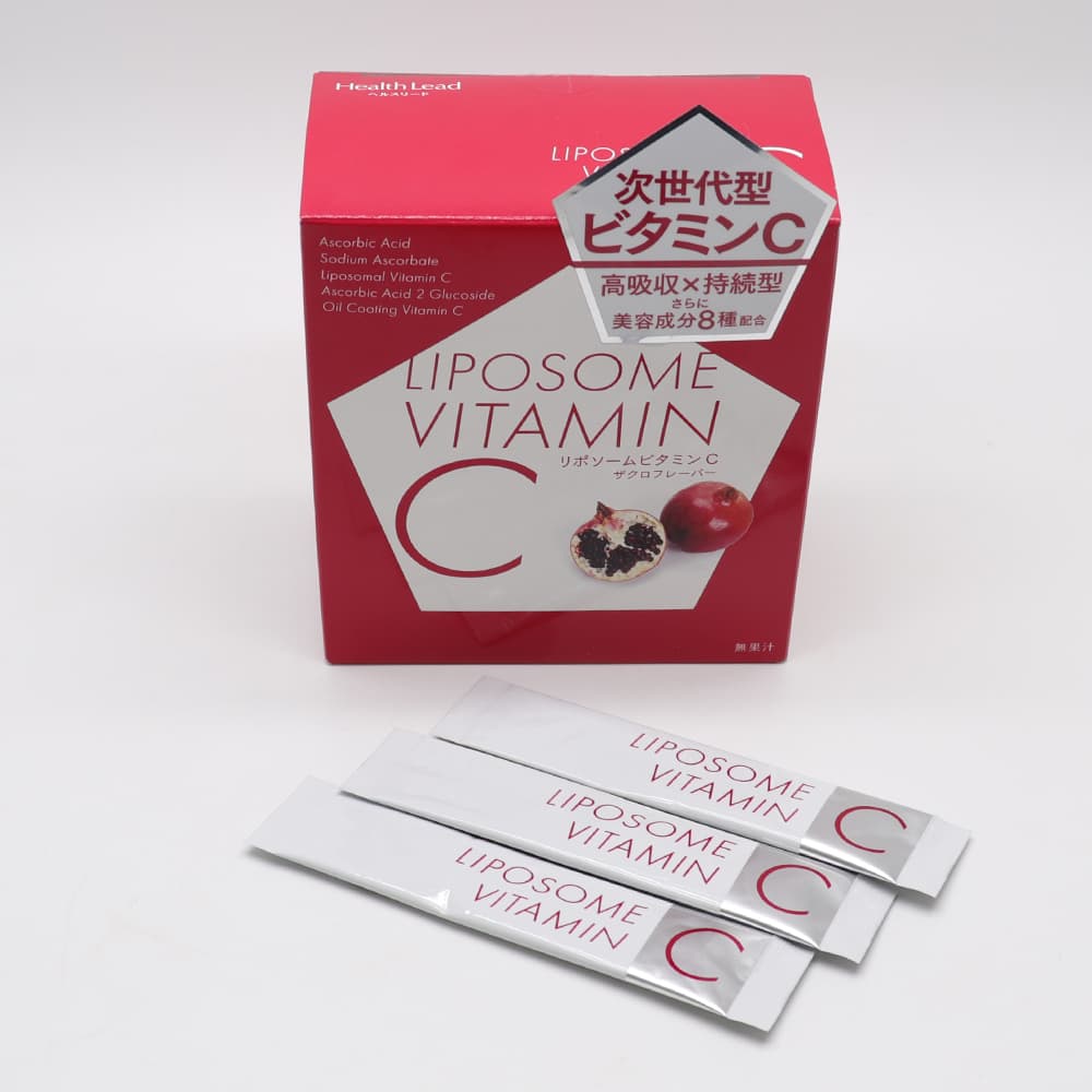 ------------------------------------------------------ 【送料無料】※沖縄・離島など一部地域を除きます ------------------------------------------------------ Health Lead ヘルスリード LIPOSOME VITAMIN C リポソームビタミンC ザクロフレーバー 無果汁 ●次世代型 ビタミンC ●高吸収×持続型 さらに 美容成分8種配合 リポソームビタミンCとは・・・ リン脂質の二重層でビタミンCを包んだ球形の構造体です。 リポソームは、水や熱などからビタミンCを守る保護シールド機能を有します。 5種類のビタミンCを配合 リポソームビタミンC アスコルビン酸ナトリウム 油脂コーティングビタミンC アスコルビン酸 アスコルビン酸2グルコシド ビタミンC1000mg/袋配合 植物由来の甘味料ステビア使用 6種類の美容成分配合 コラーゲン アセロラ ハトムギ コエンザイムQ10 ビタミンE システインペプチド含有酵母エキス 【名称】 ビタミンC含有加工食品 【原材料名】 イソマルトデキストリン(国内製造)、酵母エキス末、コラーゲンペプチド(ゼラチンを含む)、アセロラ末、ハトムギエキス末、コエンザイムQ10、ビタミンE含有植物油、デキストリン、植物性油脂/ビタミンC、香料、甘味料(ステビア)、微粒酸化ケイ素、加工デンプン、レシチン、セルロース、植物性ステロール、ビタミンP、ビタミンD 【内容量】(1箱あたり) 60g(2g×30袋) 【保存方法】 高温・多湿、直射日光を避け、なるべく涼しい所に保存してください。 【お召し上がり方】 1日1袋を目安にお召し上がりください。 ●1日摂取目安量を守り、1袋を100ml程度の水やぬるま湯に溶かしてお召し上がりください。 ●溶かした後はお早めにお召し上がりください。 ●口溶けの良い顆粒タイプですので、水なしでもそのままおいしくお召し上がりいただけます。 ●本品は天然由来原料を使用しているため、色や風味に差が生じる場合がありますが、品質に問題はありません。 ●体質や体調によりまれに合わない場合がありますが、その場合はご使用をお控えください。 ●通院・入院中の方や妊娠・授乳中の方は、ご使用になる前に医師にご相談ください。 ●食物アレルギーのある方は、原材料名をご参照の上お召し上がりにならないでください。 ●小さなお子様の手の届かないところに保管してください。 ●開封後はすみやかにお召し上がりください。 ●賞味期限の過ぎた製品はお召し上がりにならないでください。 【栄養成分表示 1袋(2g)あたり】 熱量:7.4kcal たんぱく質:0g 脂質:0g 炭水化物:1.8g 食塩相当量:0.1g ビタミンC:1000mg ビタミンE:1.0mg 【販売者】 グレートアンドグランド株式会社 〒541-0045 大阪府大阪市中央区道修町二丁目1番地10号 お問合せ先:06-6221-2820