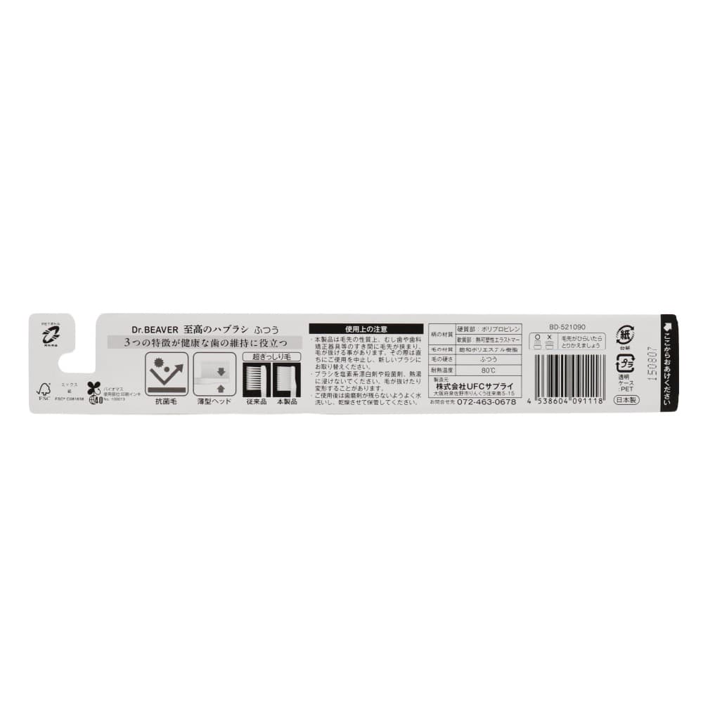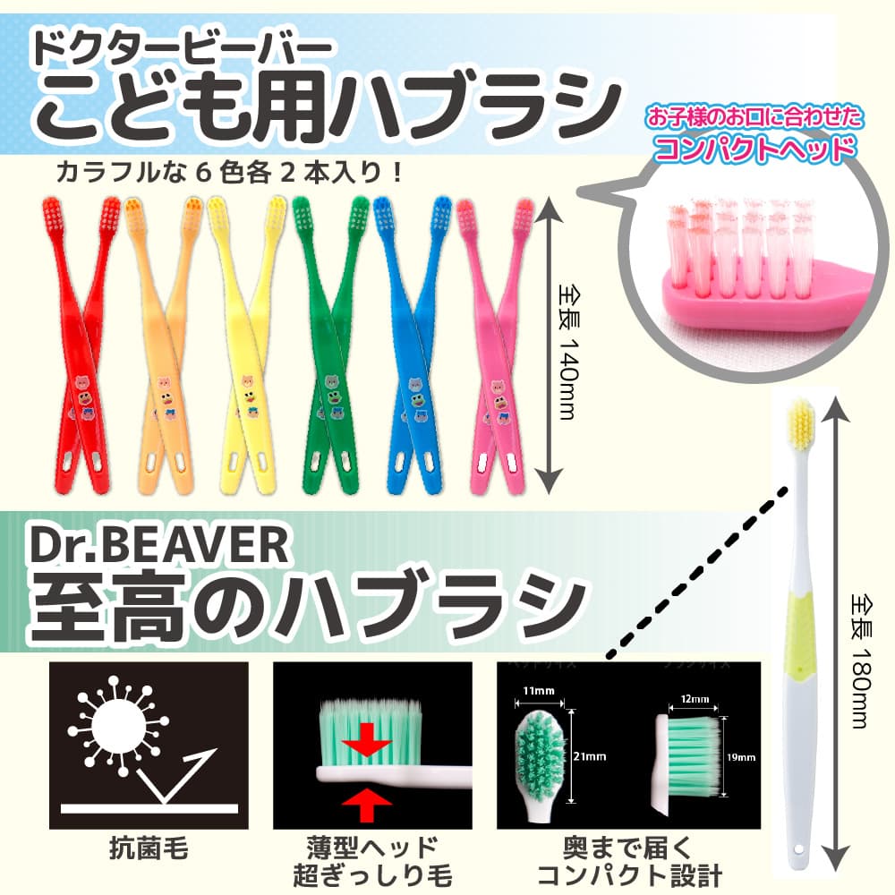 ------------------------------------------------------ 【送料無料】ネコポス(メール便)で送料無料! ■代引き不可・日時指定不可・同梱不可。 ■ポスト投函で配達完了。 ■出荷後の住所変更および住所不備による配達が発生する場合は費用が発生する場合ございます。 ------------------------------------------------------ 今だけ嬉しい!お試しセット Dr.BEAVER ドクタービーバー こども用ハブラシ 12本入 6色×2本ずつ(1袋あたり) + 至高のハブラシ サンプル1本付(1袋あたり) ------------------------------------------------------ ドクタービーバー こども用ハブラシ 12本入 6色×2本ずつ(1袋あたり) ・衛生的なチャック付袋 ・対象年齢 3才〜6才頃(乳歯期) ・衛生的な個包装パック ・日本製 【特徴】 3才から6才位までの乳歯期のお子様に最適! カラフルな6色アソート! 衛生的な個包装! 毛先がひらいたら、とりかえましょう 【注意】 ●歯ブラシを口に入れたまま遊んだり走ったりしないようご指導ください。 転倒すると喉突き事故の危険性があります。 ●ブラシを噛まないようご指導ください。 毛が抜けて飲み込む恐れがあります。 ●必ず保護者の監督のもとでご使用ください。 【使用上の注意】 ●軽い力で毛先を小刻みに動かし、歯を1本ずつ丁寧にブラッシングしてください。 ●歯ぐきを傷つける恐れがありますので、無理な力でのブラッシングはしないでください。 ●使用後は水洗いして、清潔に保管してください。 ●塩素系漂白剤や殺菌剤、熱湯にはつけないでください。変色・変形することがあります。 【柄の材質】 ポリプロピレン 【毛の材質】 ナイロン 【毛のかたさ】 ふつう 【耐熱温度】 80℃ ------------------------------------------------------ Dr.BEAVER 至高のハブラシ サンプル1本付(1袋あたり) ・歯科医推奨 ・薄型コンパクトヘッド ・ぎっしり密毛 ・抗菌毛 使用 ・持ちやすいグリップ ・日本製 【商品特長】 お口の中でブラシをコントロールしやすい薄型コンパクトヘッド。 滑りにくくしっかり磨けるソフトラバー付きグリップ。 高密度に植毛されたブラシが、やさしく効率的にプラークを除去します。 抗菌毛を採用していて、使用後のハブラシを衛生的に保ちます。 磨きやすさにこだわったハンドル設計。 3つの特徴が健康な歯の維持に役立つ 抗菌毛 薄型ヘッド 超ぎっしり毛 【使用上の注意】 ・本製品は毛先の性質上、むし歯や歯科矯正器具等のすき間に毛先が挟まり、毛が抜ける事があります。その際は直ちにご使用を中止し、新しいブラシにお取り替えください。 ・ブラシを塩素系漂白剤や殺菌剤、熱湯に浸けないでください。毛が抜けたり変形することがあります。 ・ご使用後は歯磨剤が残らないようよく水洗いし、乾燥させて保管してください。 【柄の材質】 硬質部:ポリプロピレン 軟質部:熱可塑性エラストマー 【毛の材質】 飽和ポリエステル樹脂 【毛の硬さ】 ふつう 【耐熱温度】 80℃ ------------------------------------------------------ 【製造者】 株式会社UFCサプライ 〒598-0047 大阪府泉佐野市りんくう往来南5-15 お問合せ先072-463-0678