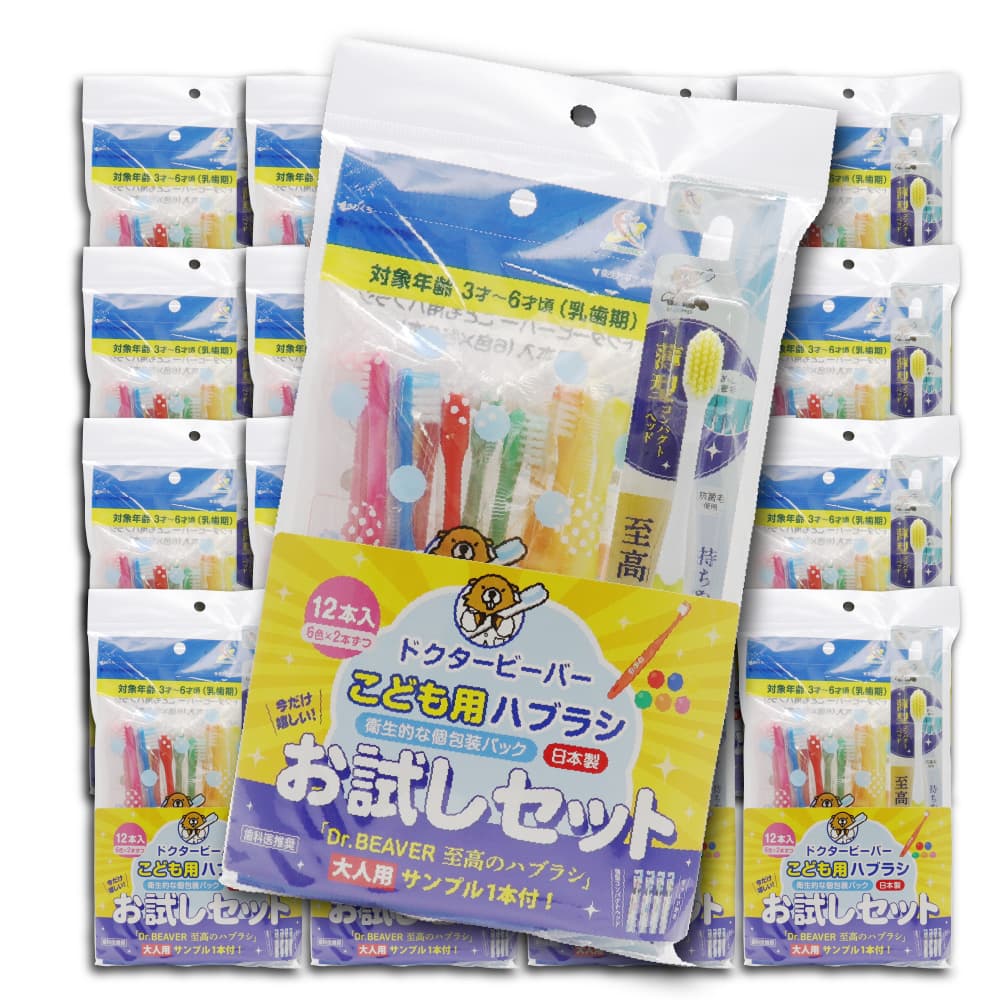 歯ブラシ こども用ハブラシ 子供用 3才〜6才 ふつう 12本入 ×20袋 + 歯科医推奨 至高のハブラシ 大人用 ふつう 20本 お試しセット 日本製 歯磨き