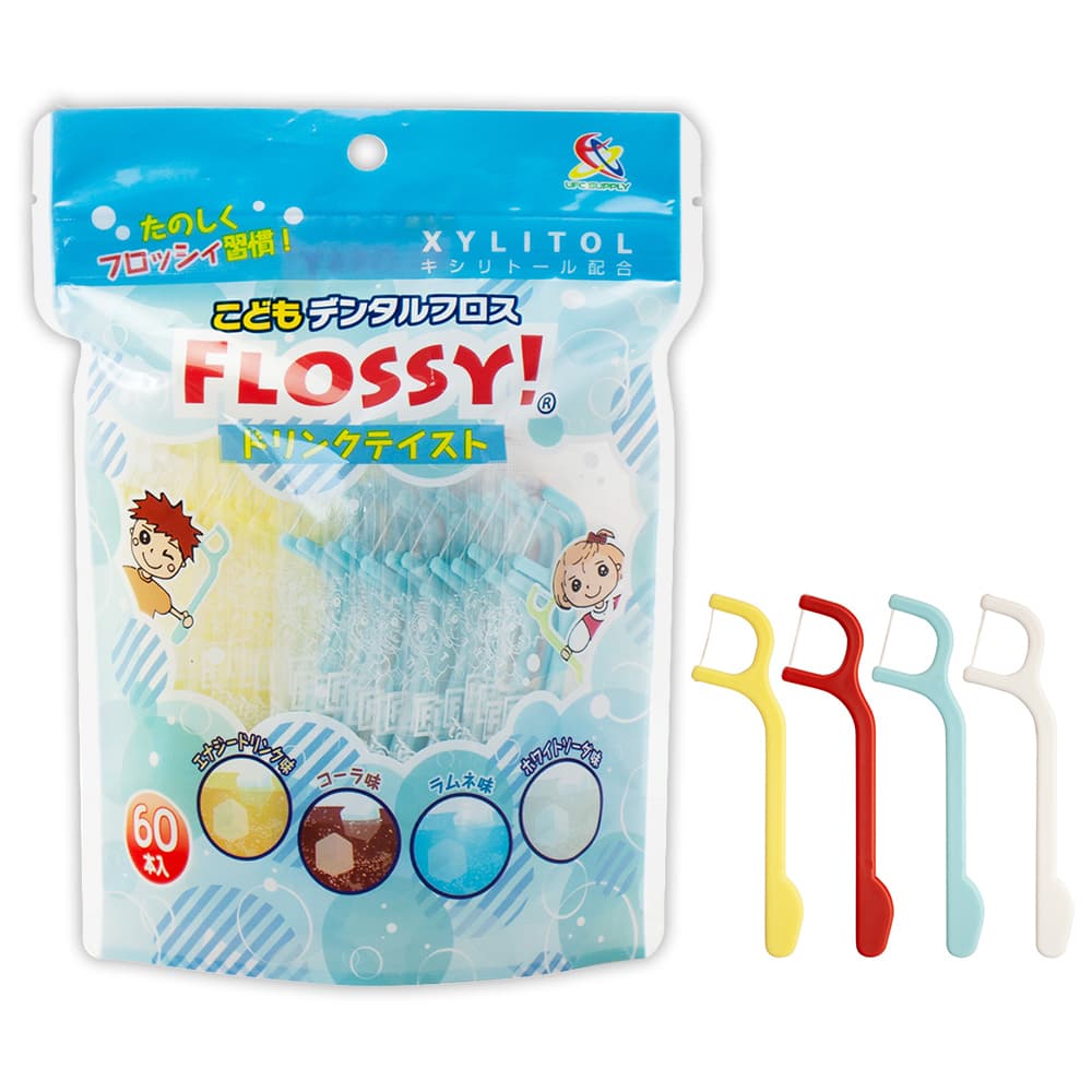 ------------------------------------------------------ 【送料無料】ネコポス(メール便)で送料無料! ■代引き不可・日時指定不可・同梱不可。 ■ポスト投函で配達完了。 ■出荷後の住所変更および住所不備による配達が発生する場合は費用が発生する場合ございます。 ------------------------------------------------------ UFC SUPPLY UFCサプライ こどもデンタルフロス FLOSSY! ドリンクテイスト たのしくフロッシィ習慣! ●XYLITOL キシリトール配合 ●いつも清潔!個包装パック ●保管に便利なファスナー付 細くて丈夫なポリエチレン製のフロスに4つの味が選べるフレーバーとキシリトールをプラス。 カラフルで楽しく、さらにおいしくお口のお手入れができます。 個包装パックでいつも清潔にお使いいただけます。 エナジードリンク味 コーラ味 ラムネ味 ホワイトソーダ味 4つのフレーバーをカラーで分けています 超極細のポリエチレン繊維を束ねた切れにくく丈夫なフロス(糸) お子様のお口に合わせたコンパクトサイズのアーチ 安全にお使いいただける丸形グリップエンドの安心加工 【内容量】1個あたり 60本入 【使用上の注意】 ●本品の使用は必ず保護者の方が行ってください。 ●歯ぐきを痛める恐れがありますのでお子様には持たせないでください。 ●フロスが入らない歯間には無理に入れないでください。 ●フロスが引っ掛かったりほつれが生じる場合、歯の詰めものが傷んでいたり、むし歯になっている恐れがありますのでお早めに歯科医にご相談ください。 ●衛生上、一度お使いになられたフロスは使用しないでください。 ●まれに白い粉が付着する場合がありますが、フレーバーに使用している成分ですので品質に問題はございません。 ●お子様の手の届かないところに保管してください。 ●開封後はなるべく乾燥した冷暗所に保管してください。 【柄の材質】 ポリスチレン 【フロスの材質】 ポリエチレン 【耐熱温度】 80℃ 【フレーバー】 日本製 ◎フレーバーはバナナ・リンゴ・オレンジ・ピーチ等を含む製品と共通の設備で製造しています。 ●FS-513330 ●台湾製 【企画・販売元】 株式会社UFCサプライ 大阪府泉佐野市りんくう往来南5-15 お問い合わせ先:072-463-0678