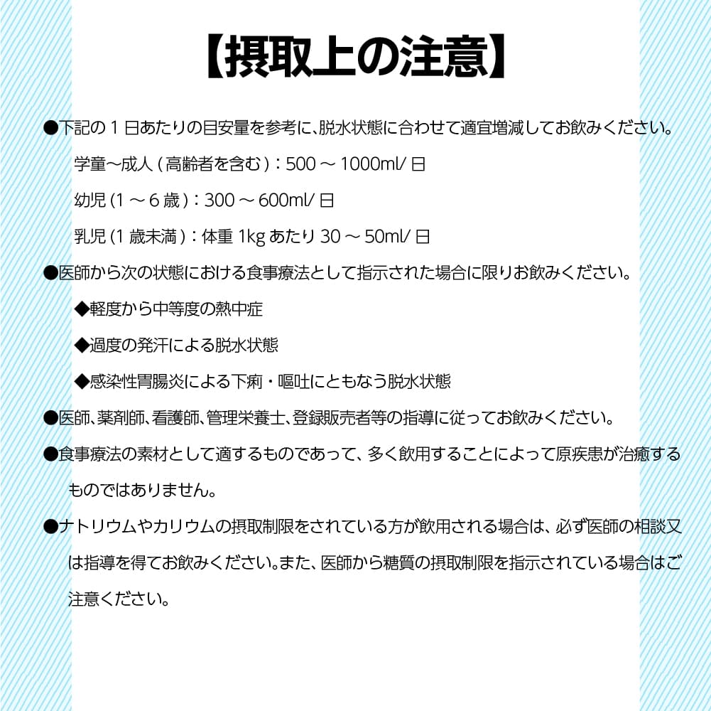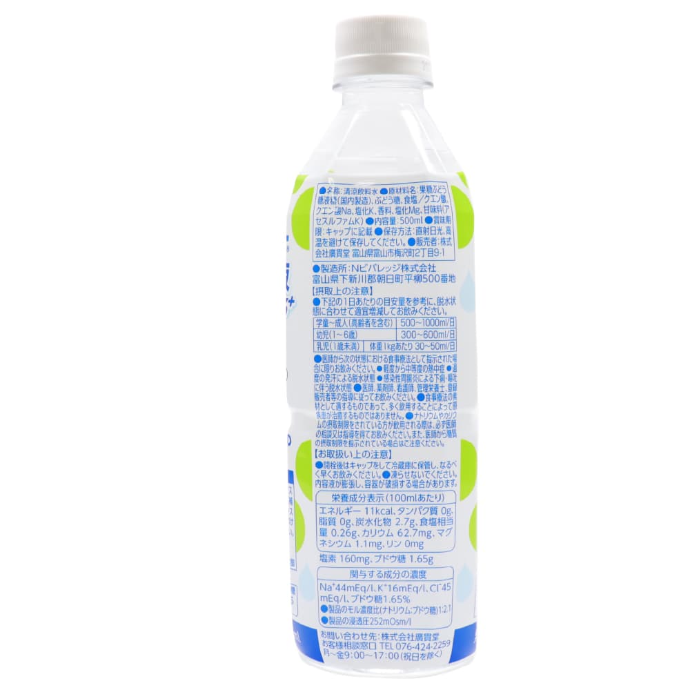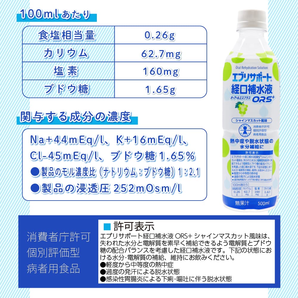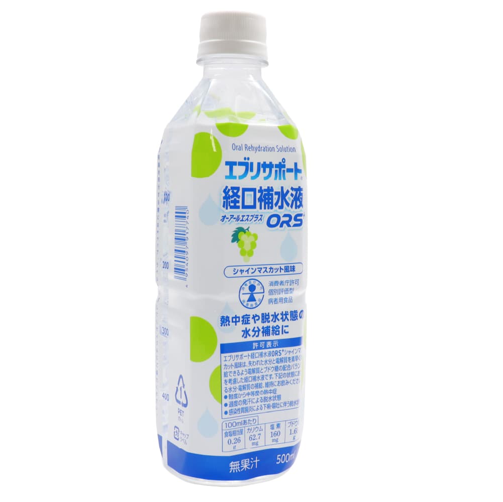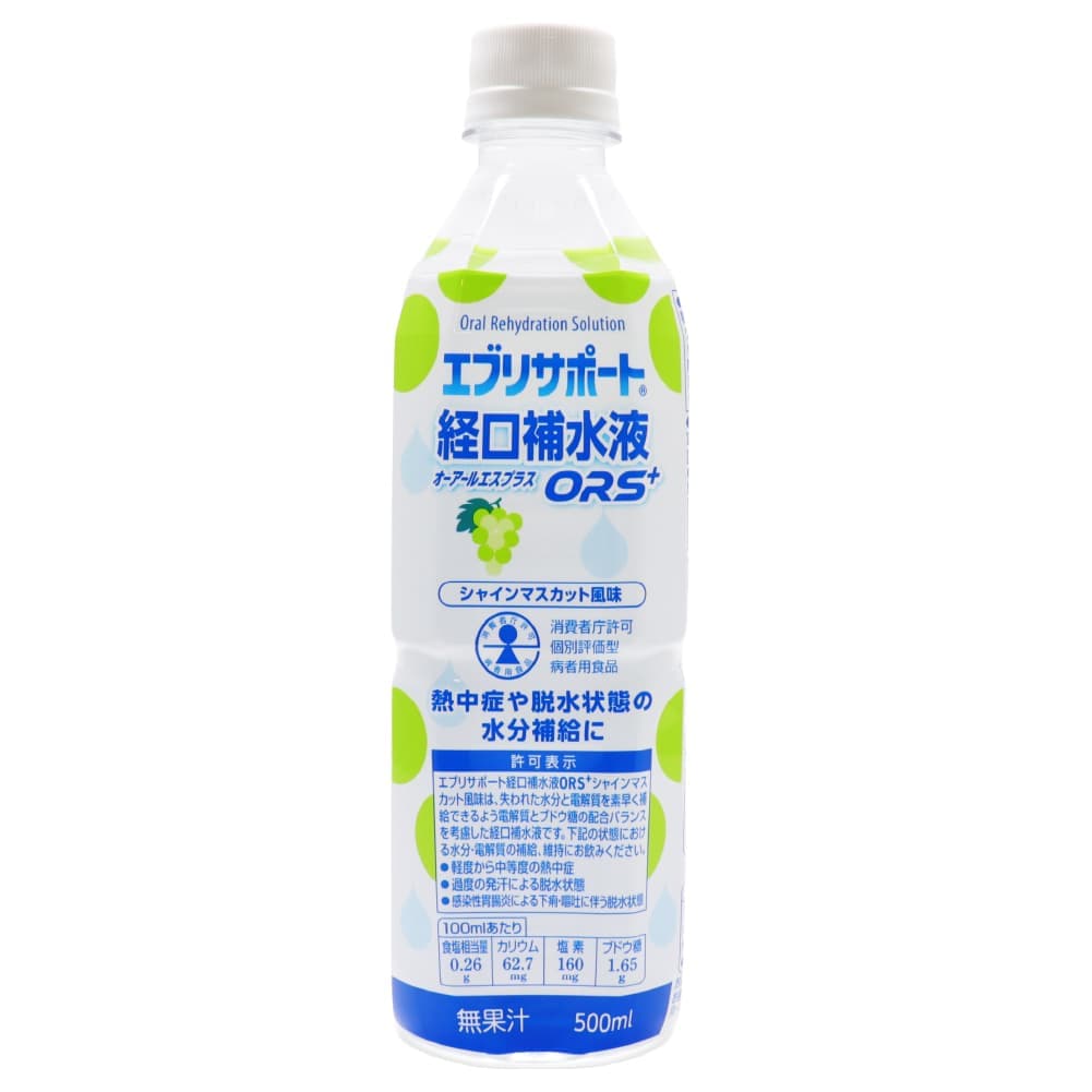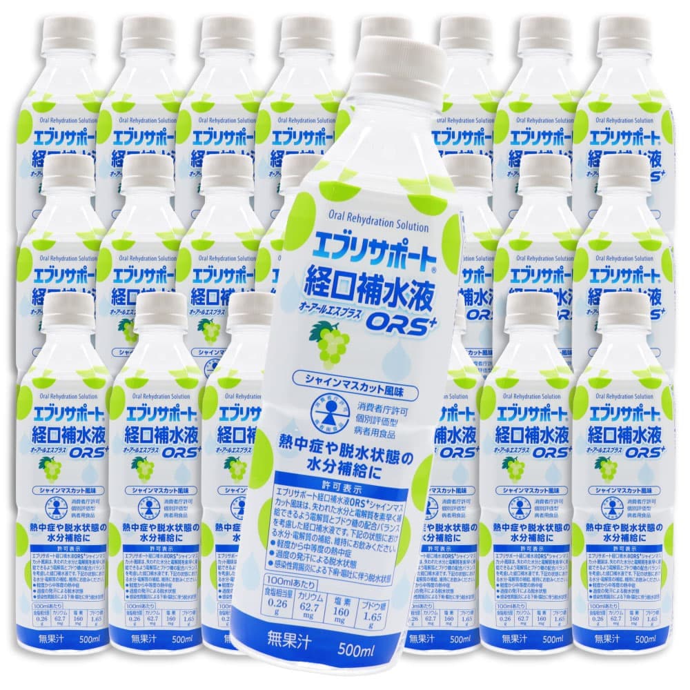 【注意】 ケース販売の特性上、その他商品の合わせ買い注文は不可とさせて頂いております。 梱包の都合上、経口補水液単品での発送となります。 他の商品と一緒にご注文いただいた場合は、キャンセルとさせて頂きます。 その際はメールにてご連絡いたします。予めご了承くださいませ。 【同梱不可】 ケース販売なので他の商品を入れることができません ------------------------------------------------------ 【送料無料】※沖縄・離島など一部地域を除きます ------------------------------------------------------ Oral Rehydration Solution エブリサポート 経口補水液 オーアールエスプラス ORS+ シャインマスカット風味 500ml(1本あたり) ・熱中症や脱水状態の水分補給に ・無果汁 消費者庁許可 個別評価型 病者用食品 【許可番号】 第2025011号 【許可表示】 エブリサポート経口補水液ORS+シャインマスカット風味は、失われた水分と電解質を素早く補給できるよう電解質とブドウ糖の配合バランスを考慮した経口補水液です。 下記の状態における水分・電解質の補給、維持にお飲みください。 ●軽度から中等度の熱中症 ●過度の発汗による脱水状態 ●感染性胃腸炎による下痢・嘔吐に伴う脱水状態 100mlあたり 食塩相当量:0.26g カリウム:62.7mg 塩素:160mg ブドウ糖:1.65g 【名称】 清涼飲料水 【原材料名】 果糖ぶどう糖液糖(国内製造)、ぶどう糖、食塩/クエン酸、クエン酸Na、塩化K、香料、塩化Mg、甘味料(アセスルファムK) 【内容量】1本あたり 500ml 【保存方法】 直射日光、高温を避けて保存してください。 【摂取上の注意】 ●下記の1日あたりの目安量を参考に、脱水状態に合わせて適宜増減してお飲みください。 学童〜成人(高齢者を含む):500〜1000ml/日 幼児(1〜6歳):300〜600ml/日 乳児(1歳未満):体重1kgあたり30〜50ml/日 ●医師から次の状態における食事療法として指示された場合に限りお飲みください。 ・軽度から中等度の熱中症 ・過度の発汗による脱水状態 ・感染性胃腸炎による下痢・嘔吐に伴う脱水状態 ●医師、薬剤師、看護師、管理栄養士、登録販売者等の指導に従ってお飲みください。 ●食事療法の素材として適するものであって、多く飲用することによって原疾患が治癒するものではありません。 ●ナトリウムやカリウムの摂取制限をされている方が飲用される際は、必ず医師の相談又は指導を得てお飲みください。 また、医師から糖質の摂取制限を指示されている場合はご注意ください。 【お取扱い上の注意】 ●開封後はキャップをして冷蔵庫に保管し、なるべく早くお飲みください。 ●凍らせないでください。内容液が膨張し、容器が破損する場合があります。 【栄養成分表示】(100mlあたり) エネルギー:11kcal タンパク質:0g 脂質:0g 炭水化物:2.7g 食塩相当量:0.26g カリウム:62.7mg マグネシウム:1.1mg リン:0mg 塩素:160mg ブドウ糖:1.65g 【関与する成分の濃度】 Na+44mEq/l、K+16mEq/l、Cl-45mEq/l、ブドウ糖1.65% ●製品のモル濃度比(ナトリウム:ブドウ糖)1:2.1 ●製品の浸透圧252mOsm/l ●容器を処分する際にはキャップ、ラベルをはずしてリサイクルにご協力ください。 【販売者】 株式会社廣貫堂 富山県富山市梅沢町2丁目9-1 【製造所】 Nビバレッジ株式会社 富山県下新川郡朝日町平柳500番地 【お問い合わせ先】 株式会社廣貫堂 お客様相談窓口 TEL.076-424-2259 月〜金9:00〜17:00(祝日を除く)